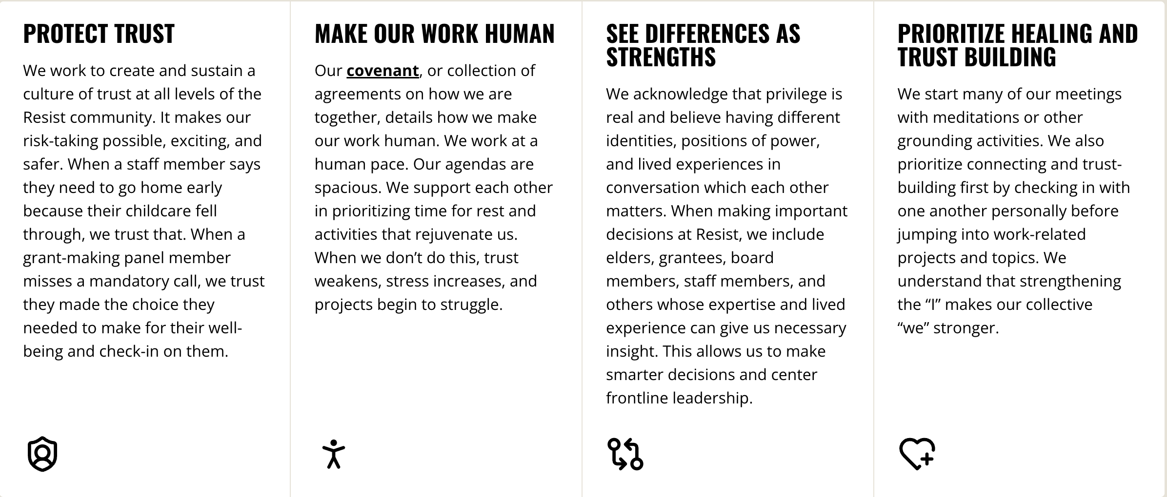 Movement Sustainability Commons adapted Resist’s framework to guide our culture - a culture of care. To learn more on Resist’s framework, click here (link to new page).